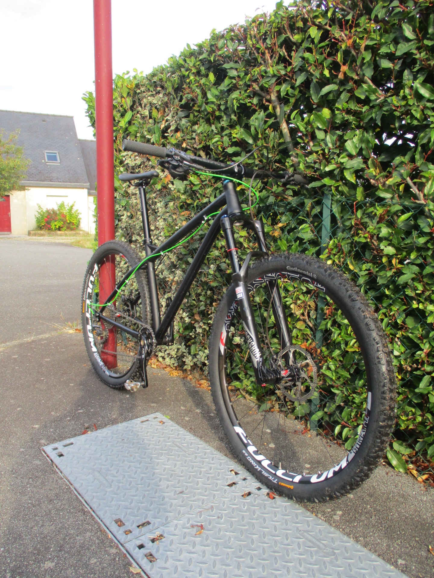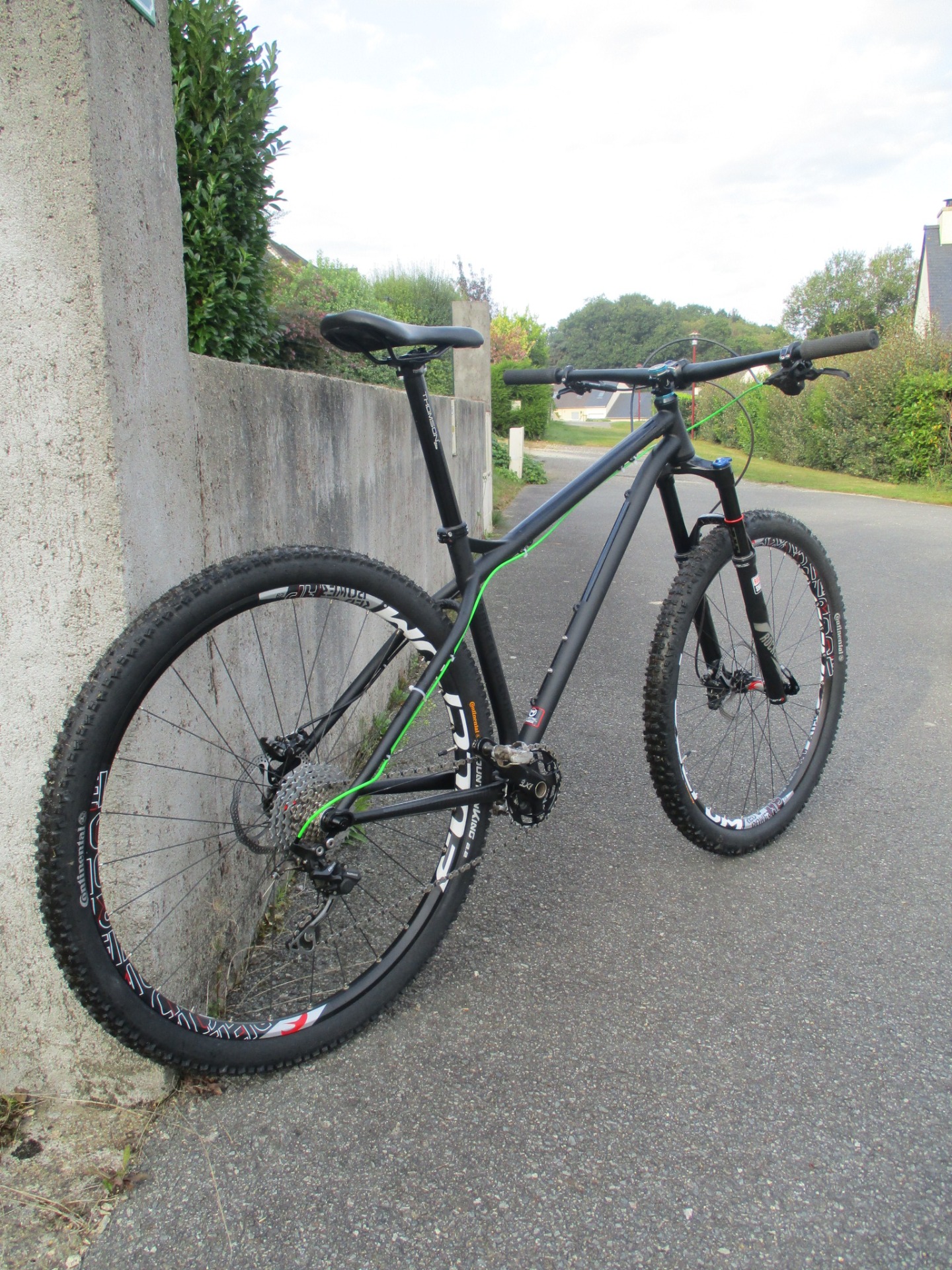 Taille M pour ce vélo équipé d'un cadre acier avec axe Boost 148/12, fourche Rockshox 150mm Reba, roues 29 pouces Fulcrum et pédalier Sram mono plateau poli par mes soins, périphérique Raceface Turbine et Thomson